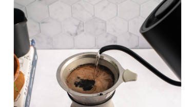 When pouring water into your dripper, aim to keep it between halfway and three-quarters of the way full throughout the brewing process. The exact amount of time each pour will take will vary depending on the amount of coffee and water being used, but it should typically fall somewhere between 20-60 seconds each time. The brewing process should fall between three to four minutes, total. Use your time to ensure each pour is falling within the correct range and that your brewed coffee is not under or over-extracting.